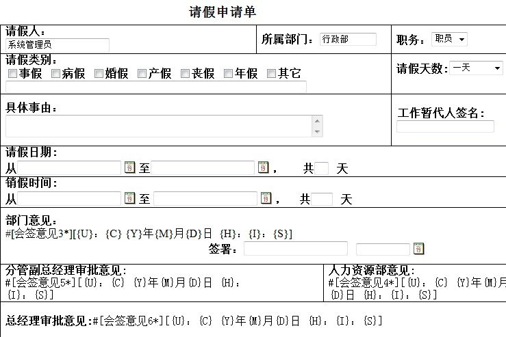 5、工作流 (1)请假申请流程: 流程功能:为规范集团员工请病/事假的管理审批程序,按公司考勤管理制度的规定,员工请病/事假申请单须提交相关领导审批后,方可休假。 流程流转说明:由申请人向本部门或本单位提出申请,经本部门或本单位领导审批后,须由公司相关领导签字批准的,经相关领导批准后交人事部备案登记 使用范围:全公司; 表单: