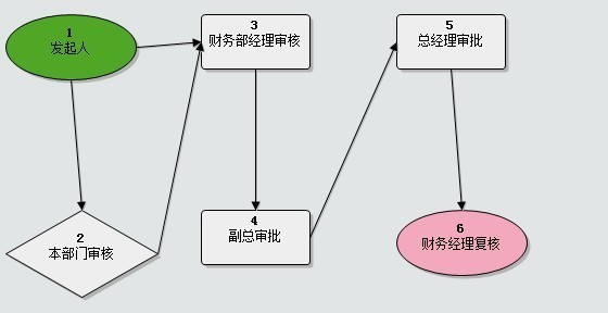 流程说明: 由申请人向本部门或本单位提出申请,经本部门或本单位领导审批后,财务经理再次复核。 1、1之后的所有步骤都有回退到这前步骤的功能,3转入条件为申请人职务为经理或者职员,如果申请人职务为经理的,下一步跳过2,直接转到3,流程流转方向为:1、3、4、5、6然后由6提醒1,并结束流程; 2、职员流程流转方向为:1、2、3、4、5、6然后由6提醒1,并结束流程; 产生的效益 通达OA有利于解决企业的日常管理规范化、增加企业的可控性、提高企业运转的效率的基本问题,范围涉及日常行政管理、各种事项的审批、办公资源的管理、多人多部门的协同办公、以及各种信息的沟通与传递。本公司建立内部统一信息发布平台,消除信息混乱;加强组织行为管理,通过规范与监控,提高执行力。 领导:通过工作流实现协同工作,规范流程,提升工作效率。实现跨时间、跨空间网络化办公,即时出差也能即时批办;同时大大提高了公司各领导和管理层的办事效率和透明度。 职员:通达OA实现了自动化,无纸化,大大提高办公效率,特别是驻外人员,子公司驻外人员,节省了长途通讯费用,无需来回打电话、发传真,流程跟踪更为方便。