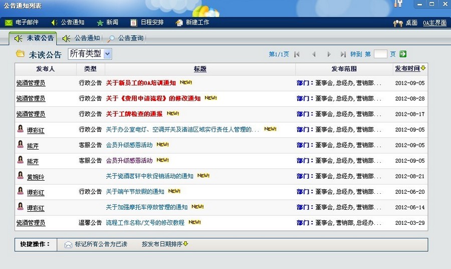 通达OA功能与实际应用举例: 通达OA的流程模块很适合公司目前实施需求,该模块成功的梳理公司的各个工作流程,使得比较凌乱的公司顿时规范化起来! OA精灵的使用就比较有特色,它将网页操作和类似QQ面板的功能都很好的结合在一起,给我们的工作带来很大的便利! 信息发布: 公司最主要的信息发布渠道为公告通知和OA群发,正式,正规的公告通知公司都会使用OA的公告模块进行编辑发布,非正式或不太重要的通知或新闻通常会采取OA群群发!公告功能和OA群是我公司使用最广泛,最常用的模块之一!切合公司实际运作!