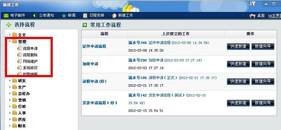 工作流: 工作流是我公司使用最广泛也是最重要的模块!公司各部门都按照制定好的流程而规范化的协同办公!公司目前花了不少时间去上线流程,包括上线需求,单部门讨论,全部门讨论,提交上线申请,管理员设计,测试和上线这几个步奏。目前公司使用的流程有52个,我们按照公司的部门划分了相对应的区(可以看下图)。各部门都有归属于自己部门的流程,部门内部的流程本部门有管理权,包括新增,查询,修改和删除功能等,而跨部门的流程,公司各部门集合开会决定; 流程的新增,修改、删除方面我们公司都会在OA上以表单的方式提出申请。