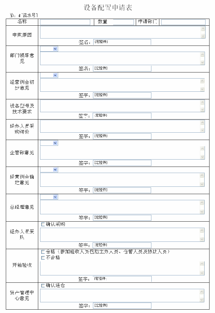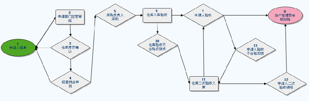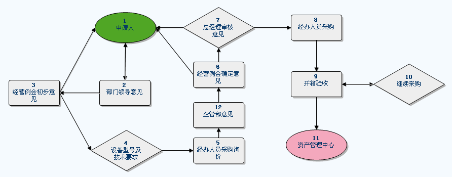 流程图说明: 2、设备配置申请流程 流程功能:企业设备采购验收入库。 流程流转说明:流程主线:1、2、3、4、5、6、7、8、9、11. 使用范围:企业所有设备设施申请、采购、验收。 表单: