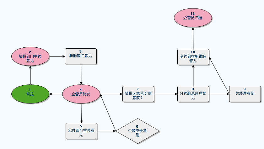 流程: 流程图说明: 3、合理化建议流程 流程功能:企业员工合理化建议以及进度落实跟催。 流程流转说明:流程主线:1、2、3、4、5、6、7、8、9、11. 使用范围:员工工作、生活合理化建议处理。 表单: