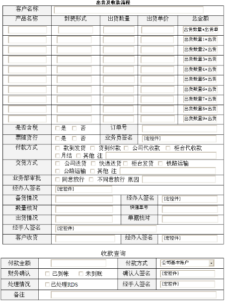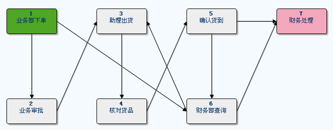 流程流转说明: 1 1即下单后转入2或者6; 2 2的转入条件是货到付款,公司代收款,柜台代收款,月结,其他,然后顺序执行3、4、5、6,此时6的转入条件是客户收货不为空,然后执行7,流程结束; 3 6的转入条件是款到发货,此时就先转入6,即查款,然后顺序执行3、4、5、7,流程结束。 下一篇: 深圳市金兄弟化工有限公司