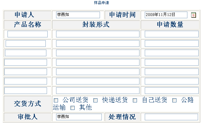 1 样品申请流程 流程功能:规范样品申请过程,形成固定流程; 流程流转说明:部门人员提出样品申请,经各级部门审批,最后反馈到申请人领取; 使用范围:业务部工程部; 表单: 流程图: 流程图说明: 由业务人员提出申请后,待审批后,备好样品,即可领取。 使用范围:各部门 2 出货流程 流程功能:规范出货程序,形成固定流程; 流程流转说明:出货人员提出出货申请,经部门审批核对给予发货,以及出货后对货物的到达及货款的跟踪; 使用范围:业务部工程部;